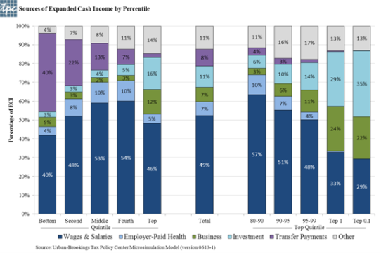 For the average American, wage income accounts for only 75% of total earnings. The remainder is made up of “business income; interest, dividends, and capital gains; alimony; and taxable Social Security benefits and pension distributions.” (Tax Policy Center)