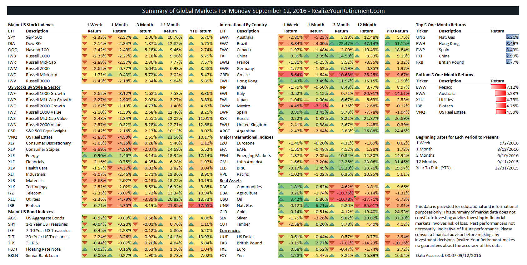 International stocks had pockets of positive returns over the past week, many in emerging markets countries such as Spain (0.99%) , Russia (0.22%) and China (0.39%). Other international markets fared poorly, however. Greece (-5.64%), Mexico (-4.45%), Brazil (-3.84%), and Australia (-2.80%). The UK fared about the same as the US down -2.41%, while Japan was only down -1.04%.